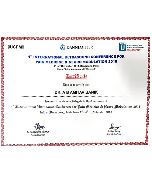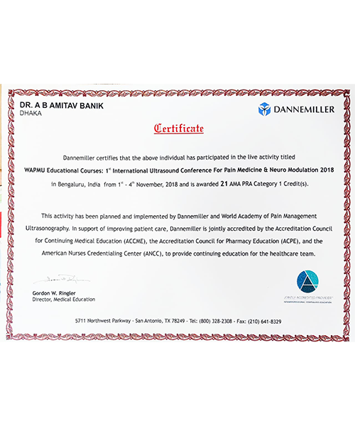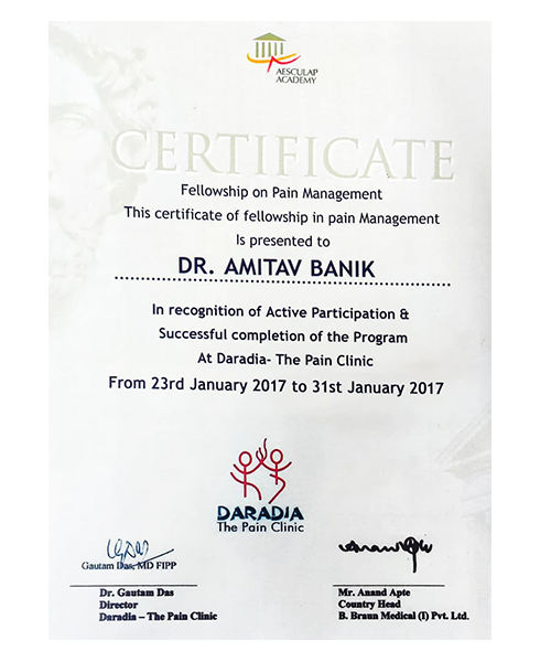 • Fellowship in Pain Management – Daradia Pain Clinic, Kolkata, India, January 2017
