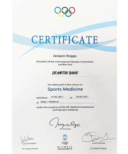 • Certificate in Sports Medicine Course, Maldives – International Olympic Committee (IOC), May 2011